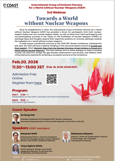 Con el fin de contribuir a un resultado productivo en la Conferencia de Examen del TNP de 2026, prevista para finales de abril, el IGEP organizará un seminario web basado en las recomendaciones emitidas en su sexta y última reunión, titulado “Alejarse del precipicio nuclear: acciones urgentes en la búsqueda de un mundo sin armas nucleares”. Este tercer seminario web tiene como objetivo fomentar el diálogo sobre temas que incluyen la reducción de los riesgos nucleares, el acercamiento entre el desarme y la seguridad, y otros elementos críticos esenciales para lograr un resultado exitoso en la Conferencia.