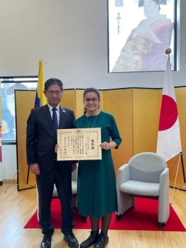 同式典では、フォレロ博士が、ロスアンデス大学教員として日本研究に長年携わり、学術誌「紅梅」の創刊編集長としても日本文化の紹介及び学術交流に尽力していること、さらに、同大学内に2018年に創設された日本文化・経済・学術センターの発展及びコロンビア日本帰国留学生会(ACOJE)幹部としての活動が称えらると同時に、来年10回目を迎える全国日本語弁論大会の創設者として日本語教育振興にも貢献し、両国間の相互理解と友好親善の促進に大きく寄与した功績が紹介されました。